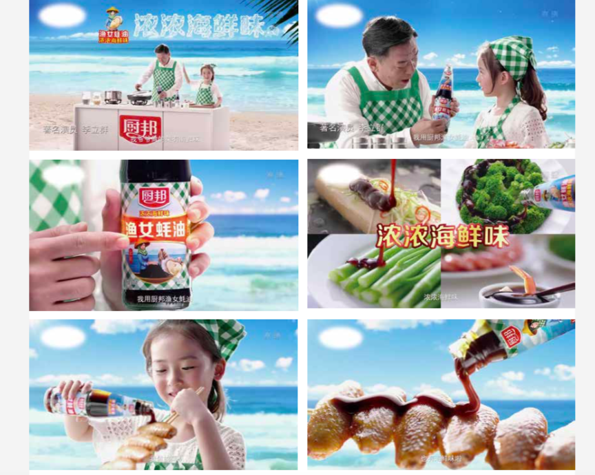 In the commercial for ChuBang, you can see the "green checker" from the first shot to the last shot. Not only on the packaging, but also on the end panel of the last shot, we also let Mr. Li Liqun wear a green checker apron to continue to build up the brand equity of the "green checker" super sign.