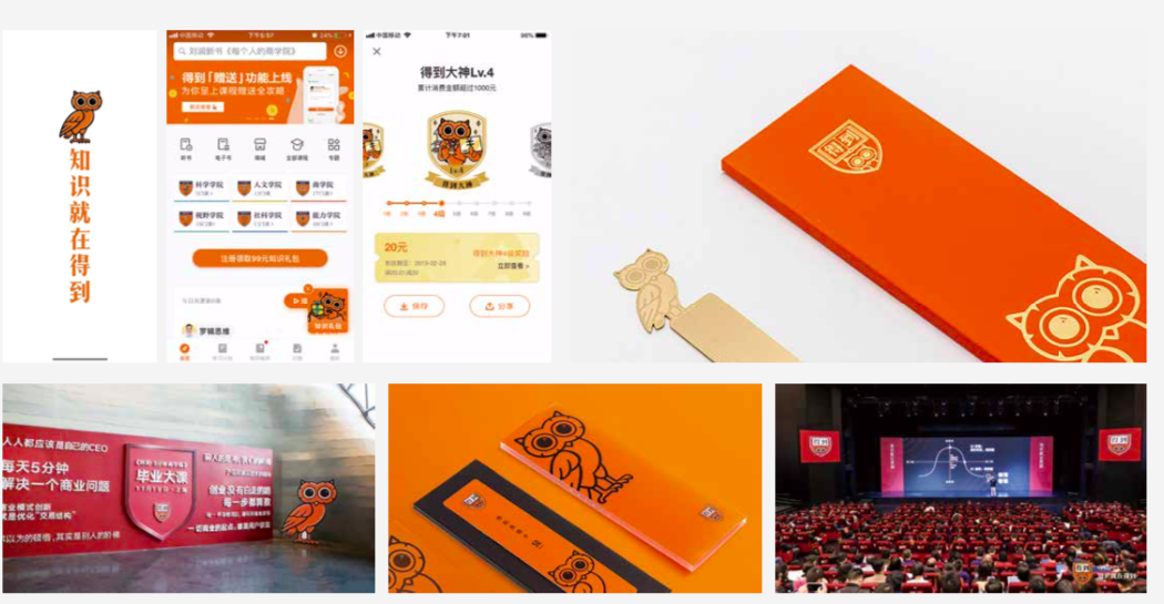 The vision for the brand is to become a new type of liberal arts college that serves lifelong learners. Since it is a university, we aim to benchmark world-renowned institutions such as Harvard, Oxford, and Yale. Therefore, we combined the "owl" which representing knowledge and wisdom, the "book" representing knowledge, the shield outline representing prestigious universities, and the brand name "得到(dao)" (meaning "get" or "obtain") into a four-in-one design combination. Thus, a logo comparable to world-renowned universities that can last for 100 years was born: the "得到(dao)" owl logo. The "得到(dao)" owl logo is memorable at first glance and can be remembered for a lifetime. Moreover, it is an auditory and describable design, which reduces the cost of dissemination.